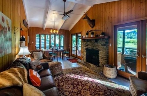 Rustic, charming Meadowbrook Lodge, nestled by a meadow and brook, with a mountain view.
