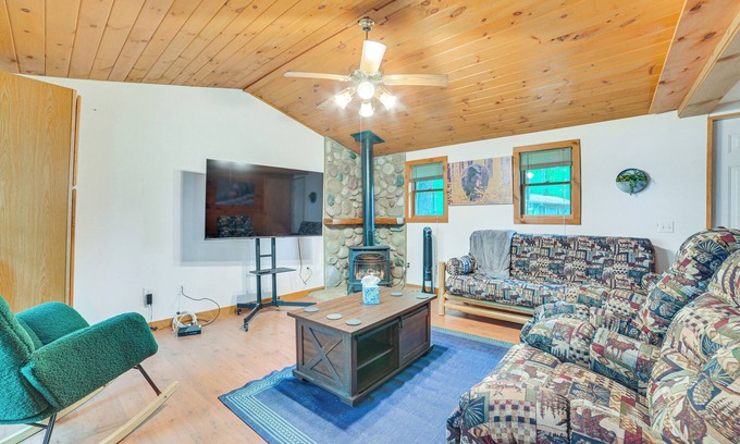 Unwind and relish the tranquility of nature with a stay at this quaint log cabin in Rose City, Michigan! 'Fish & Chipmunks' is just steps from the scenic 90-acre Loon Lake, offering easygoing opportunities for fishing, kayaking, and more. Pull up a chair and enjoy the cool breeze blowing in from the lake or spend an evening under the stars while you share stories by the fire pit. Later, get cozy inside the 2-bedroom, 1-bath vacation rental with a good book and even better company.