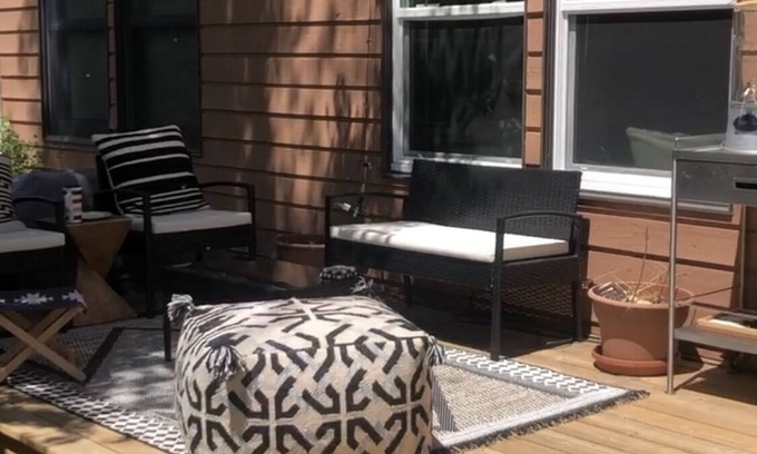 Fully furnished south-facing deck with dining and living areas surrounded by mature Aspen trees (supporting a two-person hammock) and floral landscaping, offering privacy, shade, and a quiet place to relax.