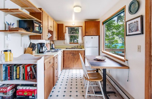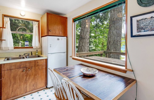 This 640-square-foot home has all the trappings of a classic Pacific Northwest escape - natural wood paneling, a wood-burning stove, and windows that frame Lake Sutherland to one side and evergreen woodlands to the other. You'll do everything within sight of the lake, whether chopping vegetables at the kitchen table, eating dinner at the picnic table outside on the deck, or curling up on the leather sofa with a movie on the TV.