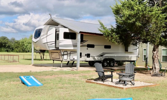 Immerse in the charm of Smithville, Texas at our rustic Ranch RV! Offering lake views and cow sightings, nature's beauty surrounds this cozy retreat. Inside, discover a comfy double bed, a sofa bed, and all your needed amenities - fridge, coffee maker, stove, oven. Warm up by the indoor fireplace, or roast marshmallows outside under the stars. Freshen up in a modern bathroom with a showerhead and toilet. Enjoy meals at the dining table or bask in the outdoors in a private sitting area. Welcome!