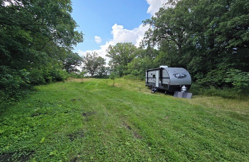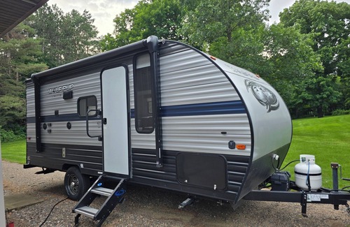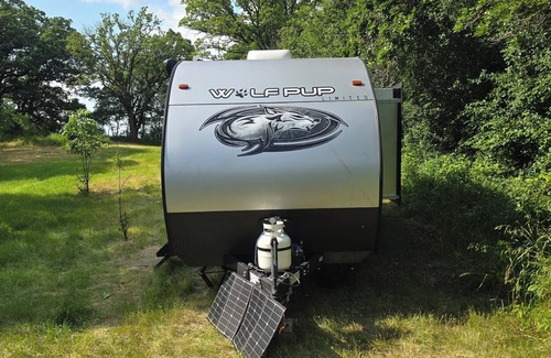 Secluded camper on 20 wooded acres. 2020 Forrest River, Cherokee Wolf Pup: 16 ft, 3,291 lbs. Includes shower, toilet, sink, kitchen, queen bed, fold-down table, power awning, heater. Generator A/C rental: $20/day. Off site fee: $40/day. Sleeps 4 adults. Water available, not for drinking. Near Cormorant Lake (10.5 mi) & Pelican Lake (14.5 mi). No electricity; generator needed for A/C and 110V. Campsite in the woods, so there will be mosquitos especially after dark.