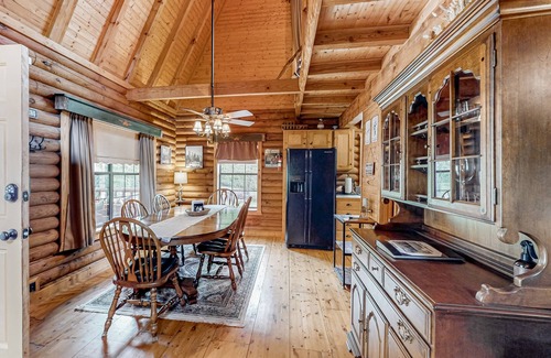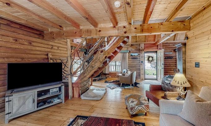 Inside the cabin, comfort and coziness abound. Kick back in the living room on plush seating, where you can enjoy a movie marathon by the warmth of the gas fireplace. The fully equipped kitchen invites the family chef to whip up delicious meals, which you can enjoy gathered around the large wooden dining table or dining al fresco with mountain views as your backdrop.