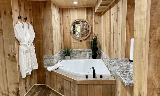 Get cozy and settle into this rustic space! Private, rustic, and romantic minutes from downtown Lexington’s restaurants and shopping. Originally the Autumn Ridge Goat Yoga studio, this space has been renovated into a gorgeous, rustic rental cottage. Wooded views and WiFi streaming tv mounted above a wood burning fireplace is all viewable from the double jacuzzi tub! Granite countertops and stainless steel appliances, king size bed, front porch rockers, and fire pit complete this unique space.