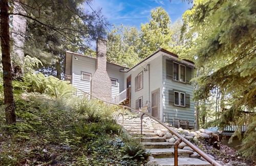 The cottage sleeps 6 in beds: There is a king bed on the main floor, a double bed in a loft, and a pair of twin beds in a downstairs bedroom (with a 6’ ceiling and its own outside entrance). Little Blue has a new bathroom including a nice bath/shower and a toilet with a bidet. There’s a living room with comfortable seating and a Vermont Castings wood stove to take off any chill, a deck with a gas grill, a stacked clothes washer and dryer, a fully equipped kitchen, and a dining room with a table for eating or games/puzzles. Free parking is available for up to three cars. Good-quality Internet connectivity is provided along with a smart TV.