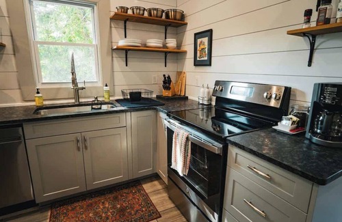 Adjacent to the living area, the compact yet fully-equipped kitchen boasts modern amenities amidst rustic decor. From stainless steel appliances to open shelving it's designed for convenience, ensuring guests can whip up meals with ease.