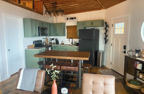 A well-stocked kitchen with a coffee bar that offers 4 different coffee brewing methods (coffee included) Pantry items we provide are oils, vinegars, salt/pepper, flour, sugar, basic spices/herbs, Nespresso pods, coffee beans, hot cocoa, tea, creamer and condiments. A full-size washer and dryer are available to use, and we provide laundry detergent for your convenience. Outside on the cabin deck you will find a propane grill. We also include a Mesa Solo Stove fire pit with wood chips for a small campfire to enjoy on the deck as you watch the beautiful sunset.