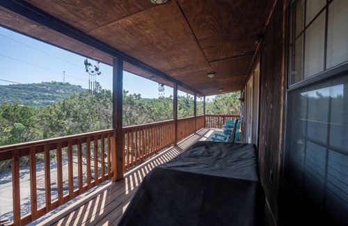 Cedar Ridge Lodge is a pet friendly rental! The front deck is perfect for drinking coffee and enjoying the views of the Frio Canyon. The backyard provides a gated pet area for your pets, a deck and BBQ area.