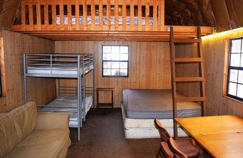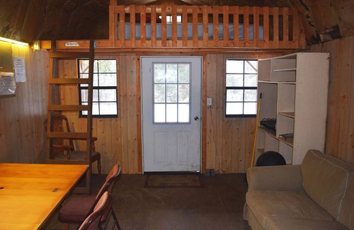 The cabins are fully furnished with beds, chairs, table, and other necessary furnishings, and our guests supply their own pillows, blankets, sheets, towels, pots, pans, plates and tableware. There are bunk beds and a queen bed on the main floor, a queen mattress in one loft and two twin mattresses in the other loft. There is a private portapotty by the cabin, a showerhouse near the main lodge house, as well as sources of potable drinking water.