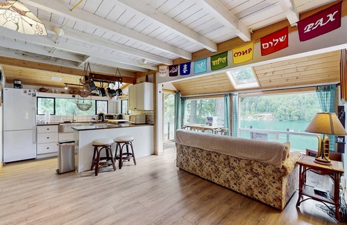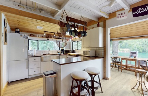 This classic lake cabin has been lovingly updated with a bright, open-concept living area, a refreshed bathroom, and a fully equipped modern kitchen.