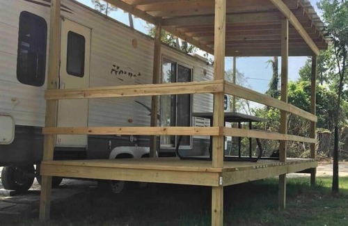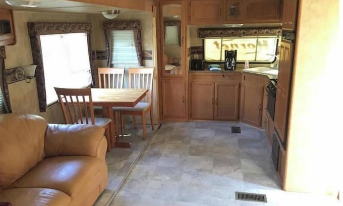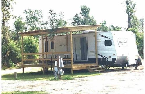 This is a nice 30' RV with a large slide out, covered deck, comfortable furnature, high speed wifi, smart TVs both in living room and bedroom, access to waterfront and 3 piers within close walking distance, and upgraded 1 ton high efficient mini-split heat pump, and 40 gal electric water heater (instead of the normal rv small tank, get wet, lather, rinse, etc before it runs out). Boat rentals, lake swimming, and fishing all available with lake waterfront on property, and just 2 miles from town.