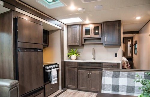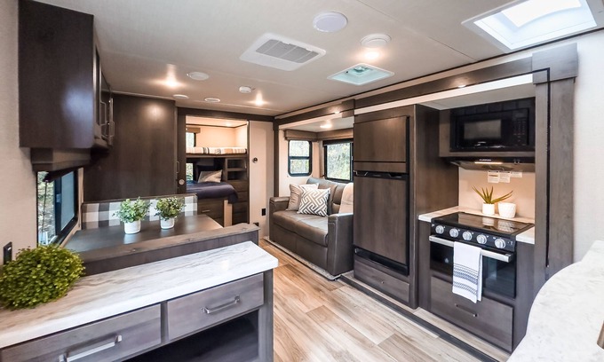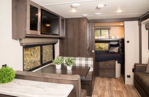 Designed for families seeking both comfort and adventure, this RV boasts a spacious layout with a single slide-out, offering a cozy retreat for up to 5 guests (ideal for 2 adults and 3 children). The dedicated bunk room features 2 upper bunks and a residential full bed below, providing a charming space for the little ones. Meanwhile, the primary bedroom welcomes you with a queen-sized bed and a wardrobe closet, ensuring a restful night's sleep surrounded by nature's tranquility.