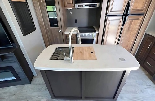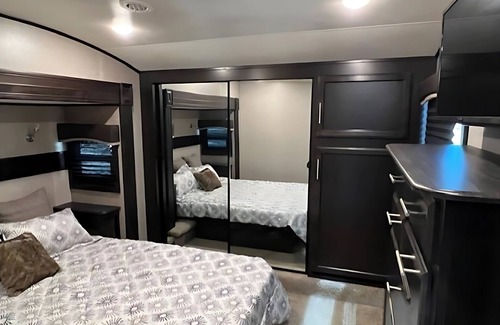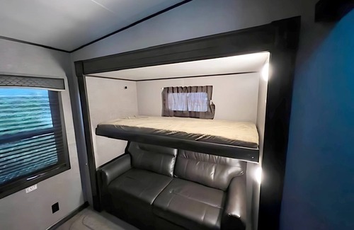 Welcome to Glamping RV 5, where nature meets luxury in the Jayco Eagle 347BHOK Fifth Wheel. Nestled against a picturesque forest backdrop with captivating lake views, our 40-foot Bunkhouse RV promises an unforgettable escape into the great outdoors.