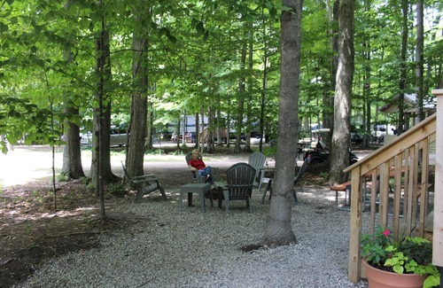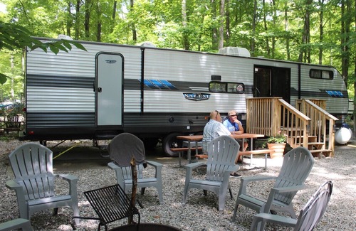 There is a master bedroom with a queen bed and a second bedroom with a queen bed with 2 single/twin beds above the queen bed. Bedding and towels for 2-6 people are included in your stay. You will want to bring your favorite blanket for those chilly nights. Kitchen has a refrigerator, stove, small oven, microwave, kuerig coffee, toaster, dishes/pots/pans and utensils. Bathroom with walk in shower, sink and RV toilet. Each RV has outdoor chairs surrounding a fire ring and a concrete patio with picnic table. Heat and air conditioning. Gas BBQ grill available. Pets are not allowed in RVs. Photo may not be exact site you are assigned.