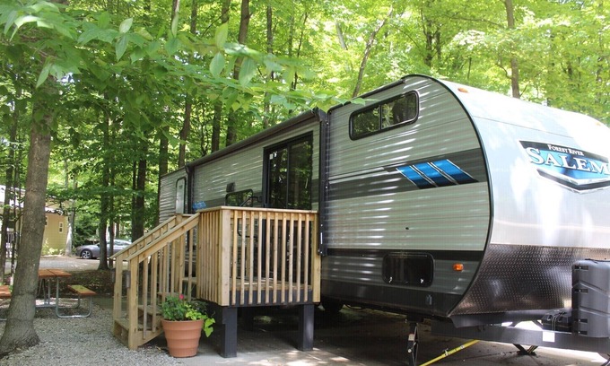 There is a master bedroom with a queen bed and a second bedroom with a queen bed with 2 single/twin beds above the queen bed. Bedding and towels for 2-6 people are included in your stay. You will want to bring your favorite blanket for those chilly nights. Kitchen has a refrigerator, stove, small oven, microwave, kuerig coffee, toaster, dishes/pots/pans and utensils. Bathroom with walk in shower, sink and RV toilet. Each RV has outdoor chairs surrounding a fire ring and a concrete patio with picnic table. Heat and air conditioning. Gas BBQ grill available. Pets are not allowed in RVs.