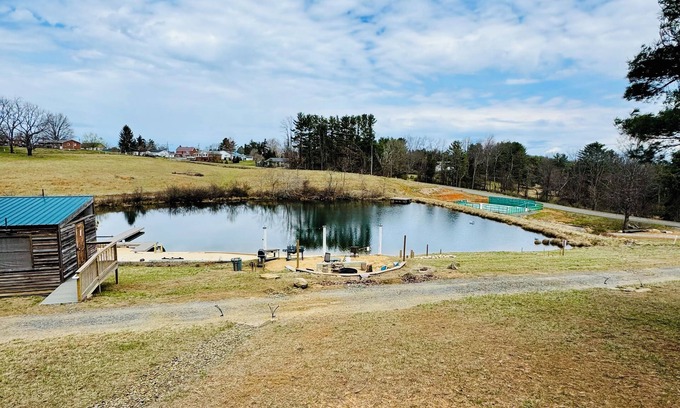 The Mountain View RV site is recommended for 24’ max length. Power and water plus WiFi. No dump facilities. We have plenty of space to welcome you. Shared bathhouse and BBQ area within walking distance to downtown Floyd and all its wonders. Green Acres Resort features a spring-fed swimming pond with its own golden sand beach, pickleball courts, fire pit and bbqs, and a custom bathhouse. Floyd Virginia is the heart of the countryside, we’re excited to welcome you to Green Acres Resort!