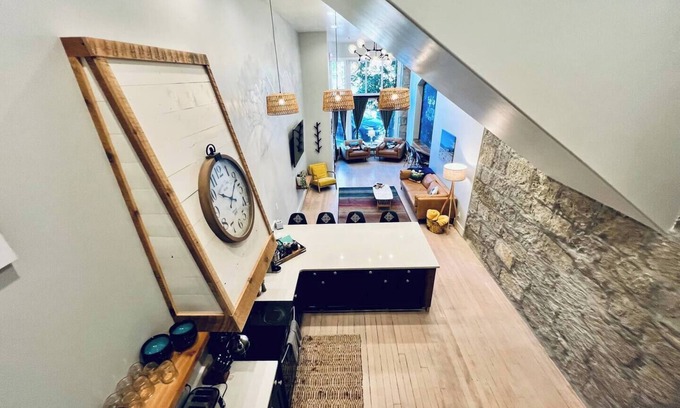 Up a short flight of stairs, the mezzanine bedroom features another king-size bed, a cozy work desk, and a great view of the kitchen and living room area below. 👀🛏️ The open loft feel makes this a fun and unique sleeping space. 😍