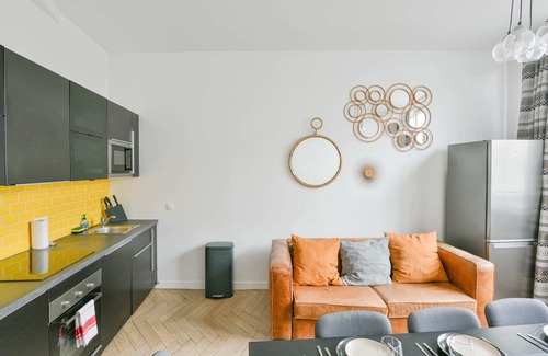 With spectacular views of the city, this apartment has been refurbished by our local interior designer for an iconic Parisian experience. Quirky surprises such as vintage-inspired furniture, vinyl records, give this apartment its charm. A fully equipped kitchen has everything you need for gourmet dining, and an in-house sauna is perfect for evening relaxation.