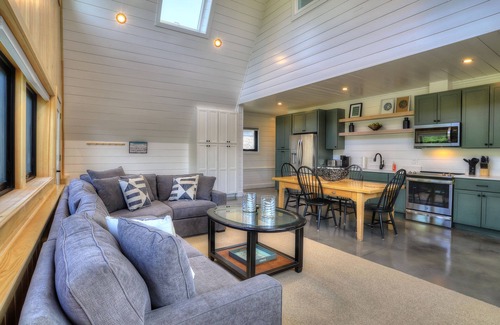The home's interior is designed for comfort and relaxation, with polished concrete floors that are heated with radiant heat, ensuring your feet stay warm after a long day of skiing or mountain biking. The open floor plan is perfect for family or group gatherings, with large windows framing the beautiful views of the surrounding mountains. The cozy living space provides a perfect place to unwind, while the fully equipped kitchen makes it easy to prepare meals and snacks after your outdoor activities.