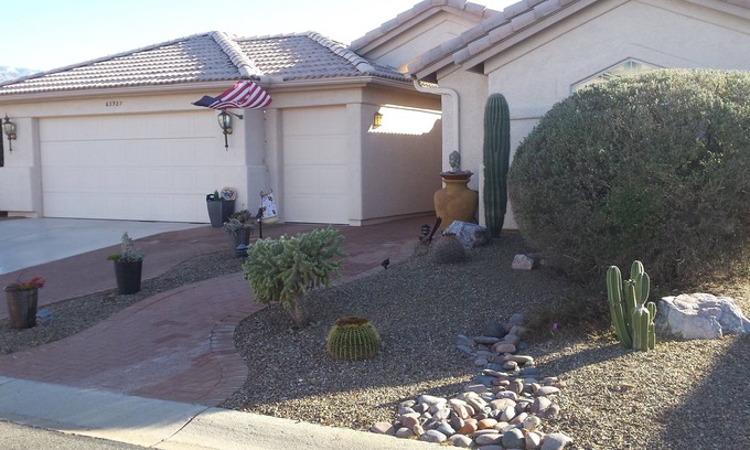 This is a completely furnished home in the Saddlebrooke development with beautiful Catalina Mountain Views from the back patio. Very private yard with a hot tub to enhance the moon and star-studded evenings. Or go for a romantic golf cart ride at dusk on the 27 hole golf course. Enjoy all the amenities of the unparalleled Saddlebrooke lifestyle. Whatever your interests, you will find clubs, sports, arts, crafts all within the resort. You and your guests can enjoy a meal in one of our fine restaurants offering delicious food and breathtaking views of the mountains, golf courses, and wildlife. The Master bedroom has a king-size bed and beautiful views of the mountains. The master bath has a Japanese soaking tub as well as a glass-enclosed shower and walk-in closet. The second bedroom can serve as an office or den and if you have guests, the queen size Murphy bed easily converts this space to a quiet bedroom. The kitchen has white cabinetry and the latest stainless steel appliances including an ice maker and water dispenser in the refrigerator door. The expansive counter top surface provides prep space for the most experienced cook. Entertaining is a joy with an open concept family room and eating area as well as the formal dining area adjacent to the living room all with the same beautiful view of the Catalina's. The laundry must be done and it is a pleasure in this expansive laundry room. The washer and dryer are top of the line stainless steel. The large counter area is perfect for folding and there is also a rack for hanging your freshly dried clothes. This home also offers an over-sized, expanded two car garage as well as a golf cart garage attached. There is a grill for barbeque and ample outdoor seating. I am an animal lover and welcome your pets, of course, with an additional deposit fee based on the number and type of pet. I am also a plant lover and ask that you water weekly with filtered water from the refrigerator water dispenser. There is soft water throughout the home and that water will eventually kill the plants.