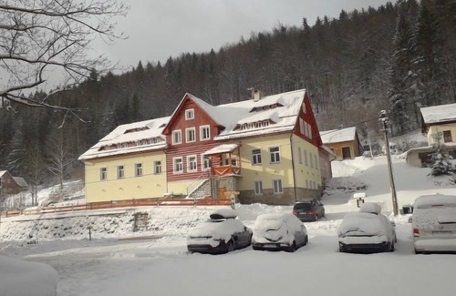 Child friendly, modern apartment block "Pod Mariánskými schody". 10 apartments in the property. 5 km from the skiing area, 100 m from the river. For shared use: property. Garden furniture, barbecue, fireplace, children's playground (slide, sandbox). In the complex: hot tub, table tennis, billiard table, playroom, table football, trampoline, storage room for bicycles, storage room for skis, central heating system, washing machine, ski boot dryer. Parking on the premises, extra. Shop 2 km, supermarket 7 km, restaurant 2.5 km, bar 2.5 km, bakery 2.5 km, bus stop "Desná centrum" 2.5 km, railway station "Desná centrum" 2 km. Walking paths from the house 500 m, ski lift 6 km, ski rental 6 km, ski school 6 km, children's ski school 6 km, cross country ski track. Nearby attractions: Protržená přehrada 6 km, Mariánské schody 400 m, Rozhledna Světlý vrch 2 km, Skokanské můstky Desná 850 m, Vodopády na Černé Desné 5 km, Riedlova hrobka Desná 3 km. Well-known ski regions can easily be reached: ski area Albrechtice 6 km, ski area Černá říčka 6 km, ski area Špičák 7 km. Well-known lakes can easily be reached: přehrada Souš 7.5 km. Hiking paths: Jizerka 16 km, Mariánská hora 2 km. Please note: suitable for families.