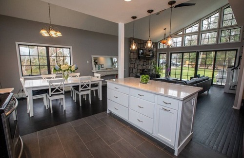 The perfect blend of modern and traditional, our solar powered home was designed to take full advantage of southern exposure light; with an entire wall of glass the focal point of our spacious and open great room/dining room/kitchen. A separate den/television room connects to the downstairs master with en-suite bathroom and has a sliding pocket door to offer privacy to your own houseguests (perfect for in-laws, with it's own private entrance). Sliders in the downstairs master and dining area open up to 400' of mahogany decking overlooking the 18 x 36' heated saltwater pool with its own bluestone patio.