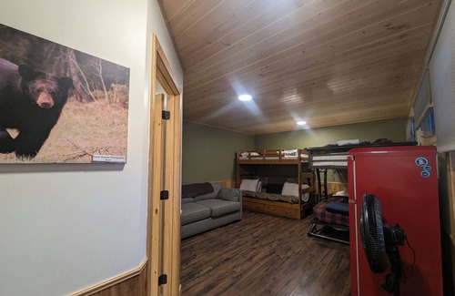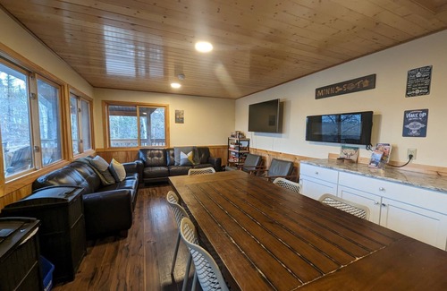Room 5 ~ A large room perfect for the whole family or a group of friends, 4 Full beds and two Singles sleeps up to 10 people. The room has its own private bathroom, fridge/freezer, and microwave. There is a community space with a kitchen and both an indoor and outdoor seating. The deck overlooks the lake and is a great place to gather with friends for dinner. Located on the edge of the Boundary Waters, a perfect place for fishing, canoeing, snowmobiling, hiking/snowshoeing, and exploring nature.