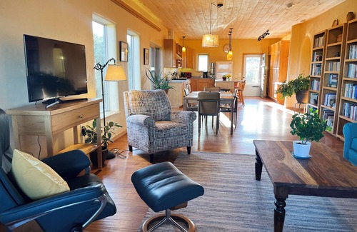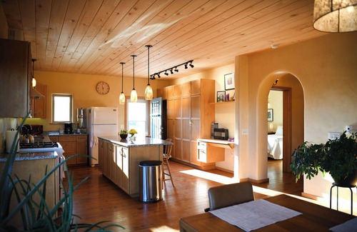 Your gracious one level home offers an intentionally furnished open-concept kitchen, living and dining area with two private and well-appointed queen bedrooms. The entire home is Universal Design and ADA compliant. Your spacious full master bath offers a soaking tub and separate tiled shower. Sliding glass and screen doors lead to your choice of covered porches, perennial gardens, or the secret orchard. Enjoy time lounging in comfy chairs taking in Taos Mountain, or napping in the hammock listening to the Stone Forest fountain. Nourish at the family table under the pergola with sunset views.