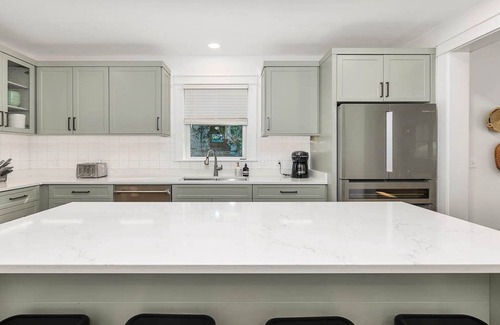 As you step onto the spacious covered porch and enter the main floor, you’re immediately embraced by a cozy seating area to the left, which flows seamlessly into the inviting living room. The open layout is ideal for entertaining, with effortless access to the large, gourmet kitchen. Designed for both beauty and function, the kitchen boasts high-end Bosch appliances, including a French door refrigerator with a wine chiller and a gas range. The dining area, nestled in the same airy space, comfortably seats 8, with additional seating at the kitchen island for casual gatherings. Off the kitchen, a charming bedroom with a tri-bunk set-up (1 full bed and 2 twin beds) and an en-suite bathroom provides a cozy retreat. A separate office/workroom downstairs offers a quiet space for checking in on work or catching up on emails. This bedroom also opens up to the private, spacious backyard, where you'll find a hot tub, a grill, and an outdoor dining area perfect for evening meals under the stars.