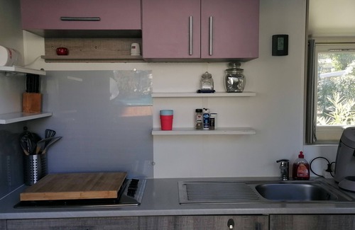 Top location in a shady pine forest. The mobile home is 28 m2 in size and equipped with a kitchen (complete with a large fridge and a fridge). Freezer, microwave, gas stove, coffee maker, all dishes etc.), Electro Grill
