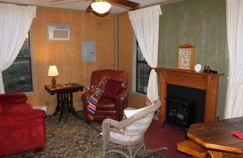 A whimsical recreation and part of Fiddlestix Village the Salt and Pepper Shaker Museum offers our guest a Hocking Hills lodging option like no other. This amazing little cottage is the perfect fit for up to three people looking to explore the area attractions. The name of our little cottage says it all. The large windows are host to an enormous collection of salt and pepper shakers years in the making. Throughout the cottage the theme remains the same and the spacious sitting room features a red plush love seat, leather recliner, wicker rocker, and an electric fireplace. When you step into the "Shaker Style" kitchenette you will find a beautiful hand crafted table with bench seating and cabinets created by local artisans.
