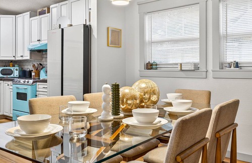 - Spacious dining area and retro-modern kitchen with turquoise Northstar stove