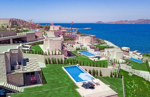 Villas with private pool, 500 square meters of usable area, 5 rooms and 6 bathrooms, with 24-hour security and reception service, in a seafront location in Yalıkavak Koyunababa. Villa facility with private pool, 15 minutes away from Yalıkavak Marina by car.