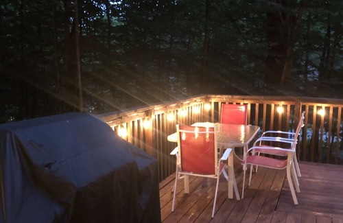 EXTERIOR: The cottage has a large wrap around deck equipped with a gas BBQ grill and an outdoor dining table. String lights hang throughout the deck area to