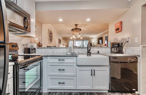 The remodeled full-size kitchen is equipped with all appliances, cookware, dishes and utensils as well as a blender, toaster, crockpot, and Keurig duo coffee pot. Also for your convenience: a new, full sized washer/dryer. And we provide starter amounts of soaps and paper products like toilet paper, paper towels, and trash bags.