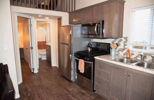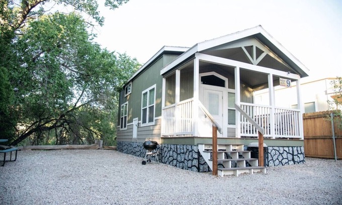 Sand Flats Cabin is a 1-bedroom, 1-bathroom tiny home that sleeps 6, just a short drive from Arches and Canyonlands. With a king bed in the bedroom, a king in the loft, and a pull-out sofa, there’s room for family or friends. Enjoy a fully equipped kitchen, climate control, Wi-Fi, and a porch perfect for desert evenings. While not pet friendly, the cabin offers first-come, first-served parking for trailers and oversized vehicles.