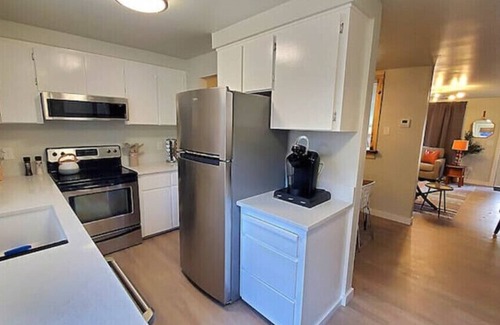 Groups up to six allowed. Sleeping options are the king or queen bed in each private bedroom (each room with its own climate control), and the queen sofa sleeper in living room. Seating for six in the formal dining room, and two more at the locally sourced cedar bartop. Also notice the custom wood accent wall. The remodeled kitchen has everything a chef needs. New fridge has an ice maker, with filter pitcher provided, and a new dishwasher for fast clean ups. Get the day started with the K-cup coffee and tea station, add a French press for serious grounds, and indulge in the free breakfast station with waffle maker, syrup and pankake mix. Don't forget the outdoor BBQ and picnic table, grill up any dish any time of year. Washer and dryer adjacent to kitchen. Heating and cooling via a new ductless mini split system, keeps temps perfect in all spaces.