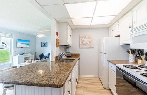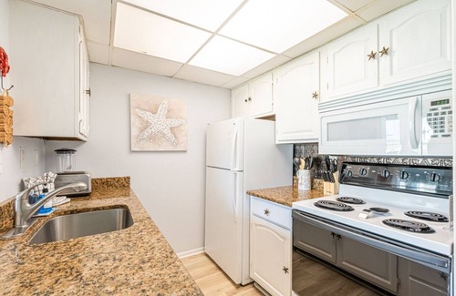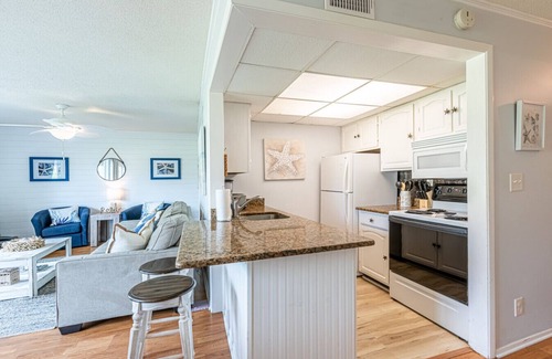 The fully equipped kitchen boasts granite countertops and everything you need to cook your favorite meals (just bring the groceries!). The dining area offers seating for four and is perfect for enjoying meals, playing cards, or planning your next beach day.