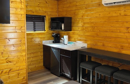Sandstone Cabins are our most basic cabin with the addition of a private bathroom. It has a lot of what you might need except a shower inside of it. They have a single queen bed, heating/AC, mini-fridge, microwave, coffee maker, toilet and sink, Cable TV, WiFi and a table with stools. We have them set up for you with all linens and bath towels included for your stay. We have a bathhouse very close by where you can shower during your stay. Outside the cabin you have a gravel parking spot for your vehicle, a picnic table and fire pit. We have additional parking for extra vehicles and trailers on site at no additional charge.