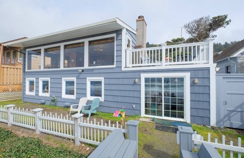 Largest oceanfront windows in Lincoln City! Watch the kids fly kites, build sandcastles or run some marshmellows down to the evening beach fire. Enjoy private beach stairs down to the sand & close walk to Tide Pools. Fireplace in Living room, dining & kitchen are great for Sand & Surf views & whale spouts. Additional entertainment room with 60" big screen and slider opening to private courtyard & hot tub, 3 queen bedrooms and 2 double bedrooms. Four bedrooms have surf views. Kitchen is fully stocked with everything you need for creating a masterpiece for the gang. The hot tub has easy access off the entertainment room and is in a private courtyard. The deck overlooks surf & sand in Roads End with plenty of wooden Adirondack chairs to relax! We work extra hard to sanitize every surface and provide con-tactless check in.