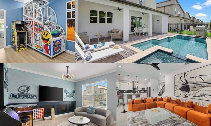 Disney and Cape Canaveral are just a short drive away, but you’ll have trouble finding the time to visit them thanks to the exceptional extras in this 3,000-plus-square-foot vacation home. In addition to the private pool and spa, you’ll find an arcade loft with classics like Pac-man Basketball, a home theater with stadium-style seating, a game room with cool “toys” like electronic darts and aracde games.
