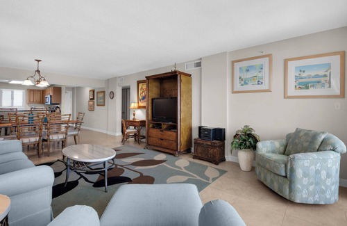 A beautiful 2 bedroom, 2 bathroom beach front condo on the 7th floor in tower 3 would make a great vacation spot for you and your family! The master suite features a king size bed, a master bathroom with a jetted tub/shower combo, and access to this units private balcony. The guest bedroom has a queen size bed, both bedrooms have TVs. The spacious guest bath has a shower/tub combo. Fully equipped kitchen with a dining room that seats 6 at the dining table and 3 at the breakfast bar. Besides a spectacular view of the Gulf of Mexico and easy access to the private balcony, the living room also offers comfortable furniture. All units include cable, WIFI, and full size washer and dryer. Book now before someone else grabs your perfect family vacation spot! Please no smoking or pets.
