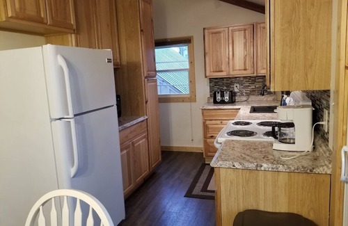 This home is 2 separate listings that we have combined into one to offer a location for larger groups that would like to have at least 2 bathrooms and more beds for their stay. This rental does not include Santa's Shack Studio unit located on same site. We added an on demand water heater so nobody has to dread taking the last shower in a large group, lol. The home is heated by natural gas wall heaters that do get hot to the touch, so please be careful with young ones. This home has 3 bedrooms. Bedroom 1 is upstairs with a queen bed. Bedroom 2 is upstairs with a queen bed and a full on bottom/twin on top bunk bed. Bedroom 3 is downstairs with a queen bed and a private entrance to bathroom 2. The downstairs living room also has a queen sofa sleeper.