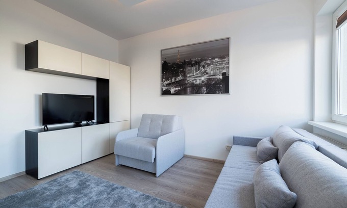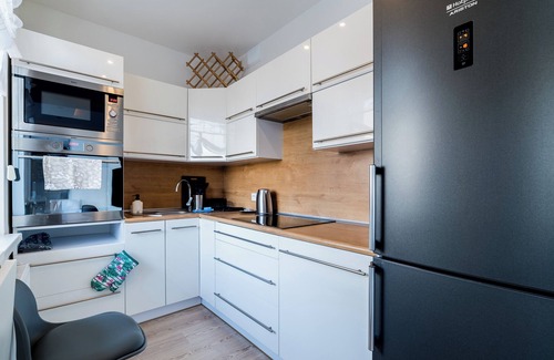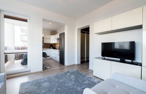 Saperska Cosy Studio features a living room with a sofa bed and a fold-out armchair, a kitchenette, a bathroom, and a spacious balcony where guests can relax and enjoy a morning coffee or an evening glass of wine. It offers a range of top-class amenities, including free WiFi, a TV, a washing machine, a hairdryer, an iron, a fridge with a freezer, an induction cooktop, an oven, a microwave, a kettle, and kitchen accessories. Guests can use the public parking area outside the building, though parking spaces are not guaranteed.