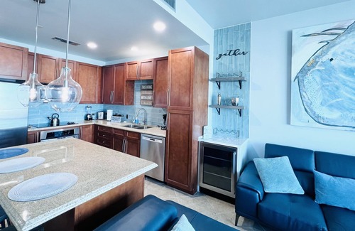 Dramatic views of the Ocean and Bay! Two large swimming pools, state of the art fitness center, movie theatre and game room for the kids are just a few amenities the Sapphire Resort has to offer our guest. This condo is located on the 6th floor and overlooks the ocean as well as the bay side of the island with private balconies. There is also an electric BBQ grill on the bay balcony for your use. This beautiful condo is decorated with calm colors for an enjoyable and peaceful setting and has everything you could want for an amazing vacation at the premier property on SPI. The condo has a super comfy king bed in the master with an amazing ocean view and a brand new 70' smart TV. The master bath is spacious with dual vanities and large separate tub and shower. There are two queens in the 2nd bedroom with all new furniture and brand new 65" smart TV, and two bunk beds in the 3rd bedroom with a brand new 55" smart TV and ready-to-go plug-ins for your Xbox or Playstation. The 2nd bath has two sinks within a large vanity for plenty of shared space, and plenty of storage containers to keep toiletries organized. New paint throughout the unit, and new furniture, decor, kitchen items and all linens make your space feel updated, relaxing and comfortable. A new dining bar adds additional seating and beverage station/refrigerator allows you to avoid spending all week putting ice into coolers just to keep beverages cold inside. Additional amenities include use of beach towels, beach chairs, a beach umbrella and boogie boards. Every TV will allow you to log into your own streaming services such as Netflix, Hulu, Amazon Prime, etc. There is also an extensive DVD library inside the unit for movie night. This condo has it all, including beautiful ocean views from the 6th floor, and it's steps to the massive pool and direct beach access. Sapphire is renowned for its resort amenities including teen room/arcade, movie room, and fitness room.