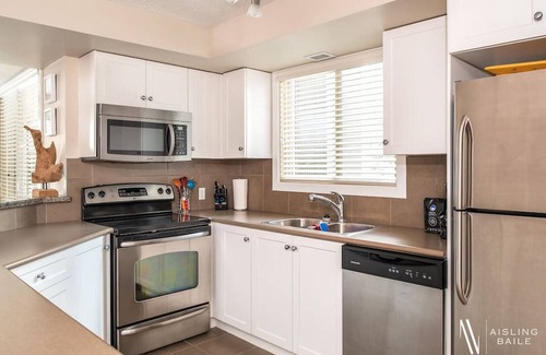 Embody the serenity of calm waters, clear skies & stoic mountain ranges at this fully equipped, central condo. Enjoy your morning cup of tea or coffee on the private patio, with views of the Rocky Mountains. Situated in the sought-after Lake Windermere Pointe community, your stay includes access to their gym, hot tub & seasonal outdoor pool. Only steps away from James Chabot Beach, you can be in the sand or skating the Whiteway in minutes. Enjoy peace & convenience here at the Sapphire Serenity.