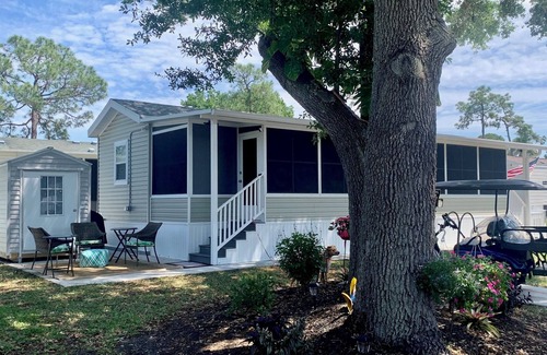 Escape to Sarasota, Florida the award winning southwestern part of the Sunshine State close to the Gulf of Mexico. Have fun, relax, and/or stay active in one of the premier, gated RV resorts Sun Outdoors, in the world! Our new, cozy park model home provides you with unlimited access to FULL resort amenities. Boasting 2 queen beds flat screen TV's in each of the two bedrooms, and a brand new queen sofa bed in the central ac/heated Lanai sleeping six comfortably. The main bathroom amenities include tub/shower combination, hair dryer, bath towels, toilet paper, starter set soap/shampoo, etc. An additional 1/2 bathroom is located in the second bedroom (ensuite). Whether you're having coffee on the garden patio, breakfast in the eat-in kitchen, relaxing in one of the two living areas, or exploring the resort, we know you'll enjoy your stay! For guests working remotely, the home has a dedicated office space and private high speed internet.