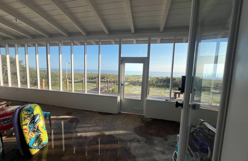 This "old Florida" 1970s build single-story bungalow offers plenty of space for a family respite or grown ups’ getaway, a soothing atmosphere to make guests feel right at home, with direct access to the dunes and beach. Walk right out into the waves! Totally remodeled with all modern conveniences and amenities, you'll love living among the exposed wooden beams, Spanish tiles, quartz countertops, curated artwork, comfy couches and more. Spend endless days on the large outdoor deck, in a rocking chair, watching dolphins or sea birds, and witnessing Florida's most beautiful sunset views.