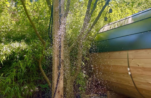 OUTDOOR SAUNA AREA - the newest addition to Boho House and undoubtable the best. One-click electric 10-foot western red cedar Barrel Sauna that fits 6 persons comfortably. Get it hot and steamy, up to 90 degrees celsius, with light water and essential oils. Step out and cool off in the cold waterfall shower, then chill out in the Adirondack chairs by the propane fireplace.