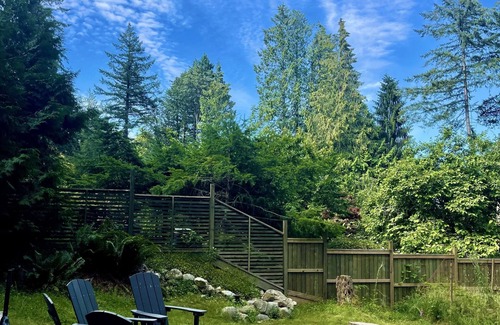 Relax and recharge at this unique Bohemian sanctuary on Bowen Island complete with an electric cedar barrel sauna, wood-burning hot tub, 2 gas fire pits, and a sprawling lawn with open skies and peak-a-boo mountain views. Start your day with yoga and meditation, sink into the oversized Cloud couch and watch Netflix, take a 2-minute walk to the beach at Millers Landing, cook amazing meals on the gas range and BBQ, and fall asleep peacefully in the deluxe King beds to trees swaying in the breeze.